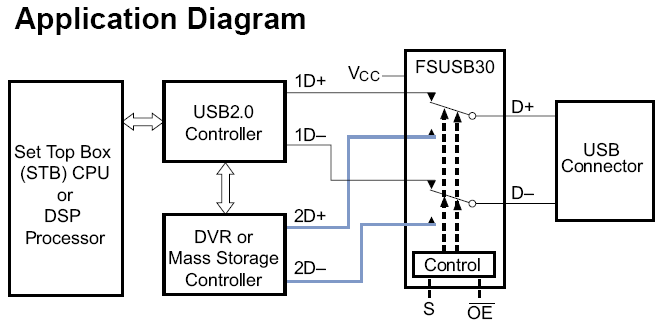 The FSUSB30 contains special circuitry on the D+/D- pins which allows the device to withstand an overvoltage condition when powered off. This device is also designed to minimize current consumption even when the control voltage applied to the S pin, is lower than the supply voltage (VCC). This feature is especially valuable to ultra-portable applications such as cell phones, allowing direct interface with the general purpose I/Os of the baseband processor. Other applications include switching and connector sharing in portable cell phones, PDAs, digital cameras, printers, and notebook computers.
