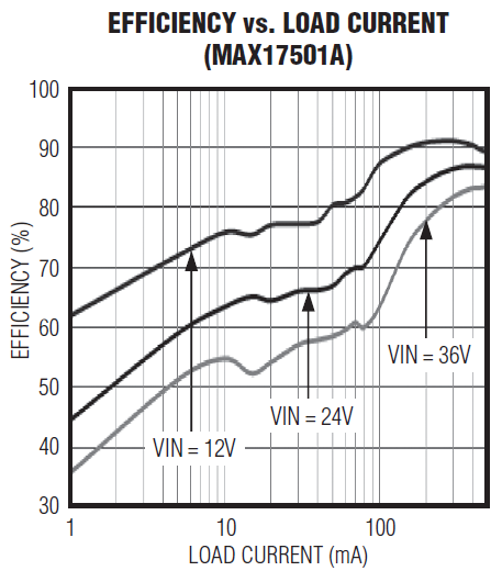 >84%, 24V in, 3.3V @ 200 ~ 500 mA >80%, 36V in, 3.3V @ 240 ~ 500 mA |